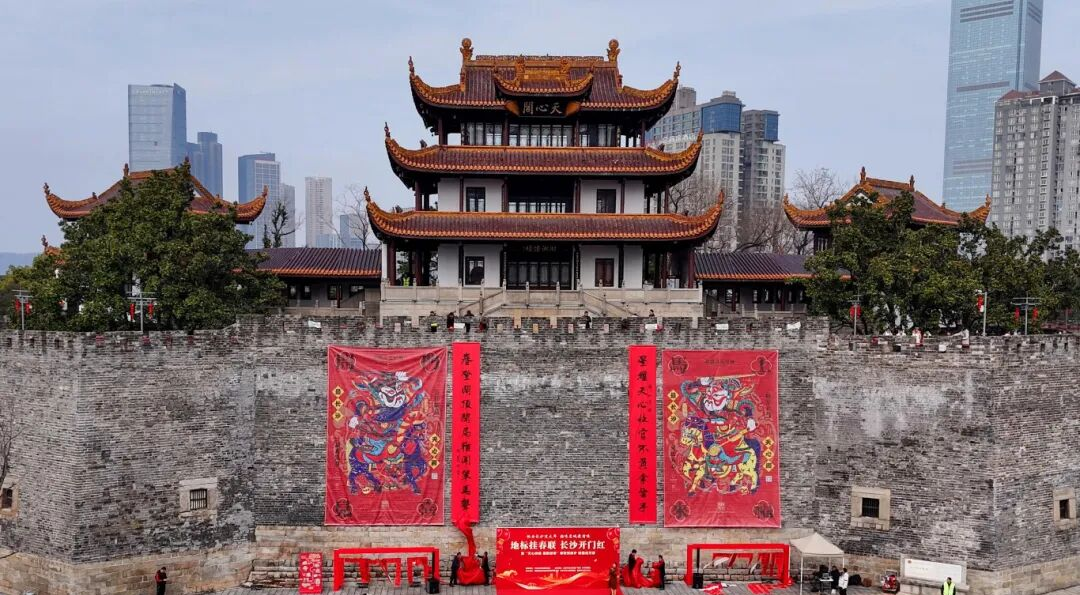 春节期间,长沙的天心阁、中山亭、浏阳门等地标都挂上了喜气洋洋的火红春联。