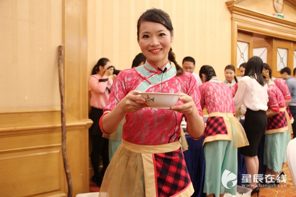 (发布会现场,“桃江美人”为嘉宾奉上益阳擂茶)