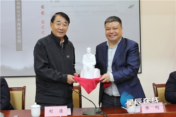 (中共长沙市委常委、宣传部部长陈刚向刘源将军赠送刘少奇同志坐像模型)