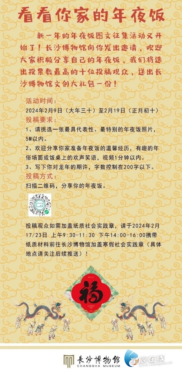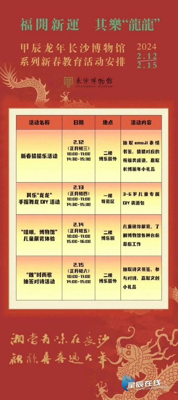活动介绍:福龙高照、龙腾四海、祥龙献瑞……你还知道什么新年吉祥语吗?快来长沙博物馆抽取emoji表情书签,猜猜对应的祝福类成语,有机会领取甲辰龙年长沙博物馆结合馆藏“民国红底绢绣牡丹仙鹤图”图案及“明代双龙金冠”金龙设计定制的福字哦,数量有限,先到先得。