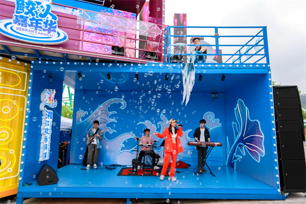 活动现场打造了多巴胺色系的集装箱舞台,限定上演鲛人幻海音乐LIVE秀!一场别开生面的音乐盛宴在湘江欢乐海洋公园震撼上演!本地乐队倾情演奏,鲛人伴着音乐出海热舞,解锁出颠覆常规的潮流新玩法。现场氛围格外热烈,游客朋友们纷纷加入,伴着音乐挥手摇摆,掀起一场视听盛宴!