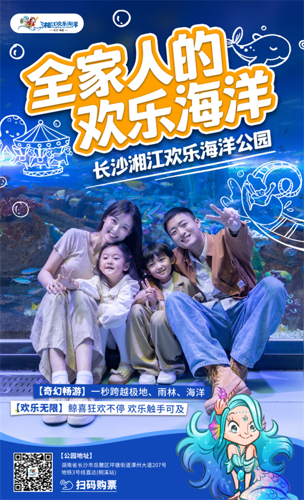 长沙湘江欢乐海洋公园是大王山旅游度假区湘江欢乐城的重要组成部分,总占地面积约30万平方米,水体体量3万立方米,总建筑面积约7.8万平方米。园区集海洋、极地、萌宠动物展示、机械游乐及多媒体体验、主题演艺、海洋文化科普为一体,汇聚了数十种、百余只珍稀濒危的极地、海洋动物和近4万尾各类观赏鱼类,并在全省首次引进北极熊、帝企鹅等极具南北极代表性动物。有关湘江欢乐海洋公园鲛人节限定优惠的票价政策,详情可关注“长沙湘江欢乐海洋公园”微信服务号及“长沙湘江欢乐海洋公园”官方OTA渠道了解详情。