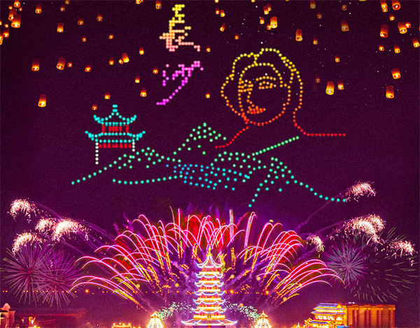 光影交错,无人机烟花秀献礼华诞