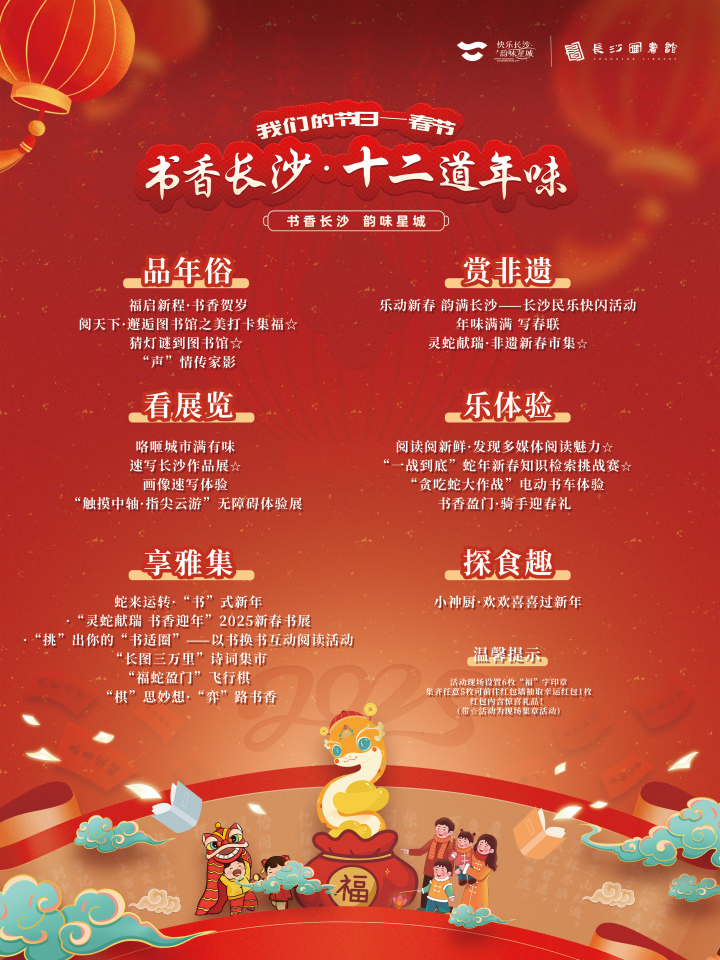 星辰在线1月20日讯(通讯员 周驰宇)随着蛇年春节的脚步日益临近,长沙图书馆精心筹备的“书香长沙·十二道年味”系列活动即将在小年当天拉开帷幕。一系列丰富多彩的文化活动,将带领市民读者在书香中感受浓浓的年味,度过一个别样的小年。