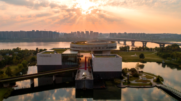 美术馆建筑空间格局以“三湘四水”为基本意象,主体建筑采用赭红色与白色定制陶板和周边环境相融合。展馆由展览区、公共服务区、学术研讨区、藏品管理区、办公区等区域组成。