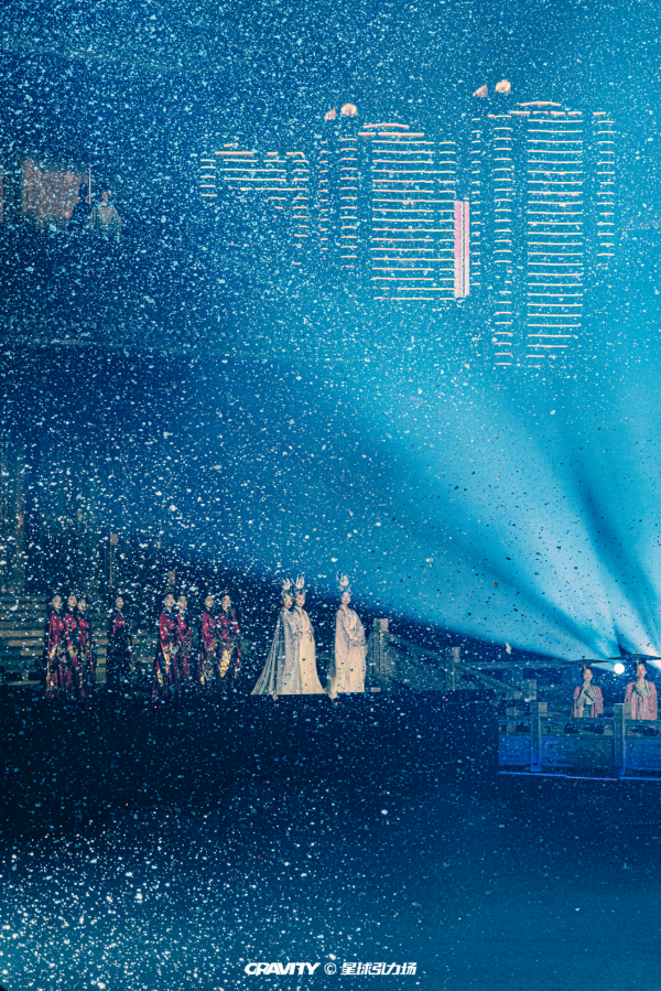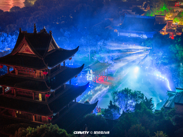 《花开橘洲·江天暮雪》光影诗画秀,正是这场千年文脉的当代回响。演出采用“景随戏动”的行浸式观演模式,以声、光、水、雾、电为画笔,打破传统舞台边界。随着鼓声响起,一个自千年前而来的平行宇宙就此展开。