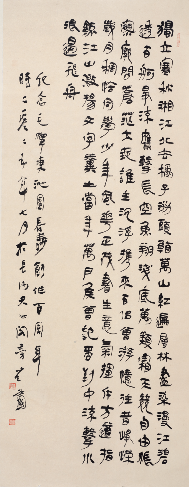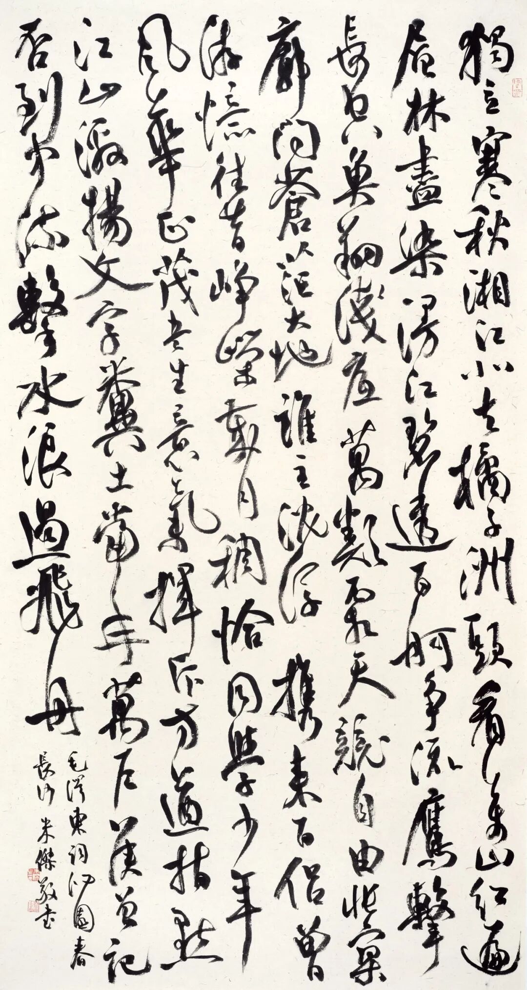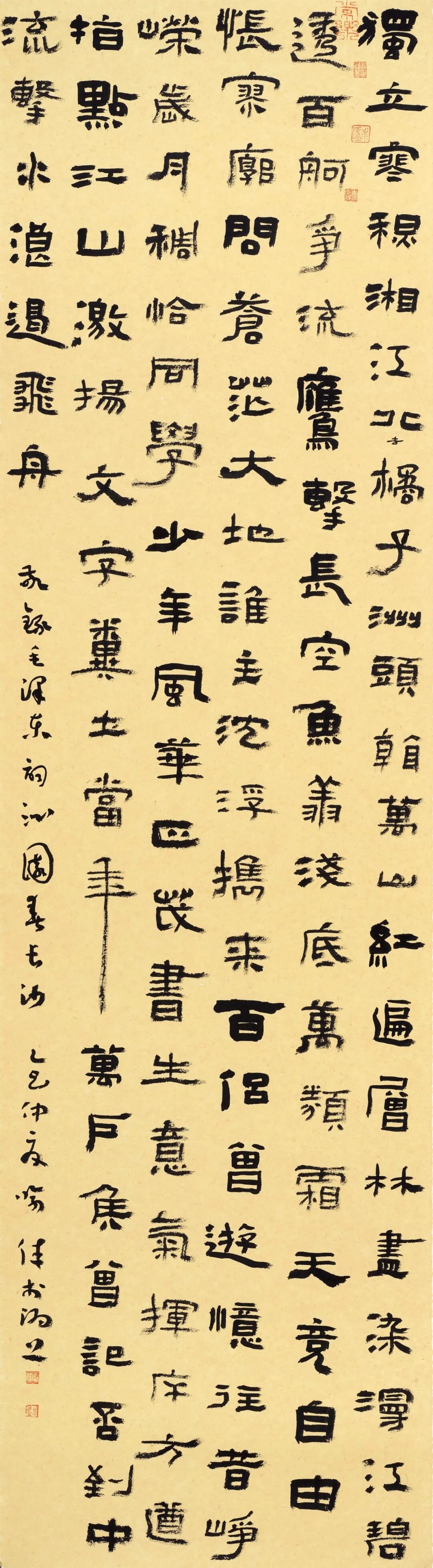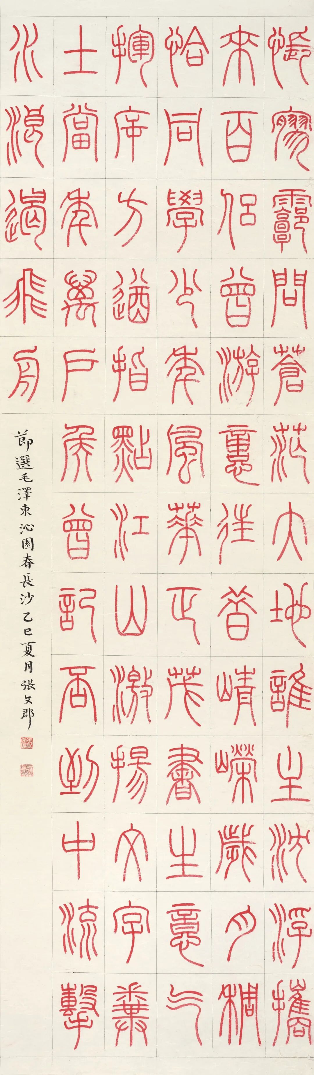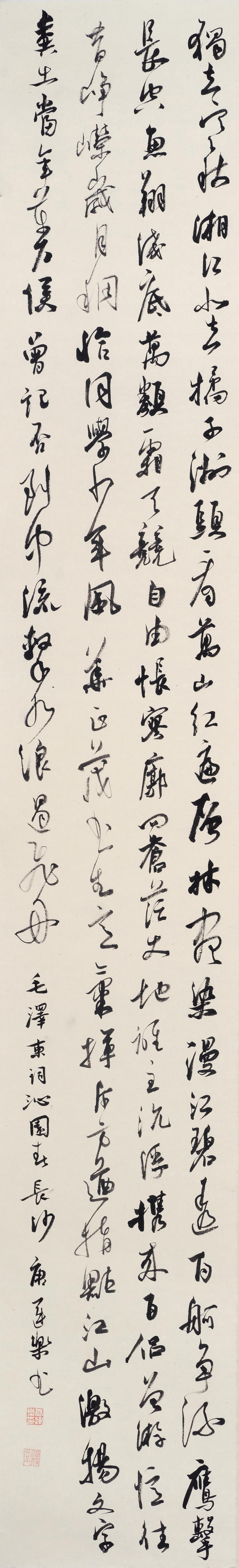 “独立寒秋,湘江北去,橘子洲头。”一九二五年晚秋,青年毛泽东重游长沙故地,于湘江畔观秋景、思时局,挥毫写下《沁园春·长沙》。词作以“万类霜天竞自由”勾勒自然生机,以“问苍茫大地,谁主沉浮”抒发时代叩问,以“到中流击水,浪遏飞舟”彰显青年担当,不仅是中国现代文学史上的经典篇章,更承载着特定历史时期的精神脉络与文化记忆。百年之后,我们立足词作诞生之地,以书法篆刻这两种传统艺术形式举办专题展览,既是对文学经典的学术性致敬与艺术化阐释,亦是对革命文化精神的当代传承与创新性转化。