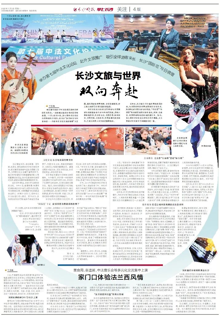 近年来,长沙致力于打造世界旅游目的地,与法国在内的世界各国经济文化艺术、旅游等多方面交流与日俱增,“甲亢哥”“无语哥”等全球顶流网红纷至沓来,欧洲、东南亚、中国香港等地的客商轮番打卡。如今,第七届中法文化论坛在长沙拉开帷幕,又为星城对外交流书写浓墨重彩的一笔。