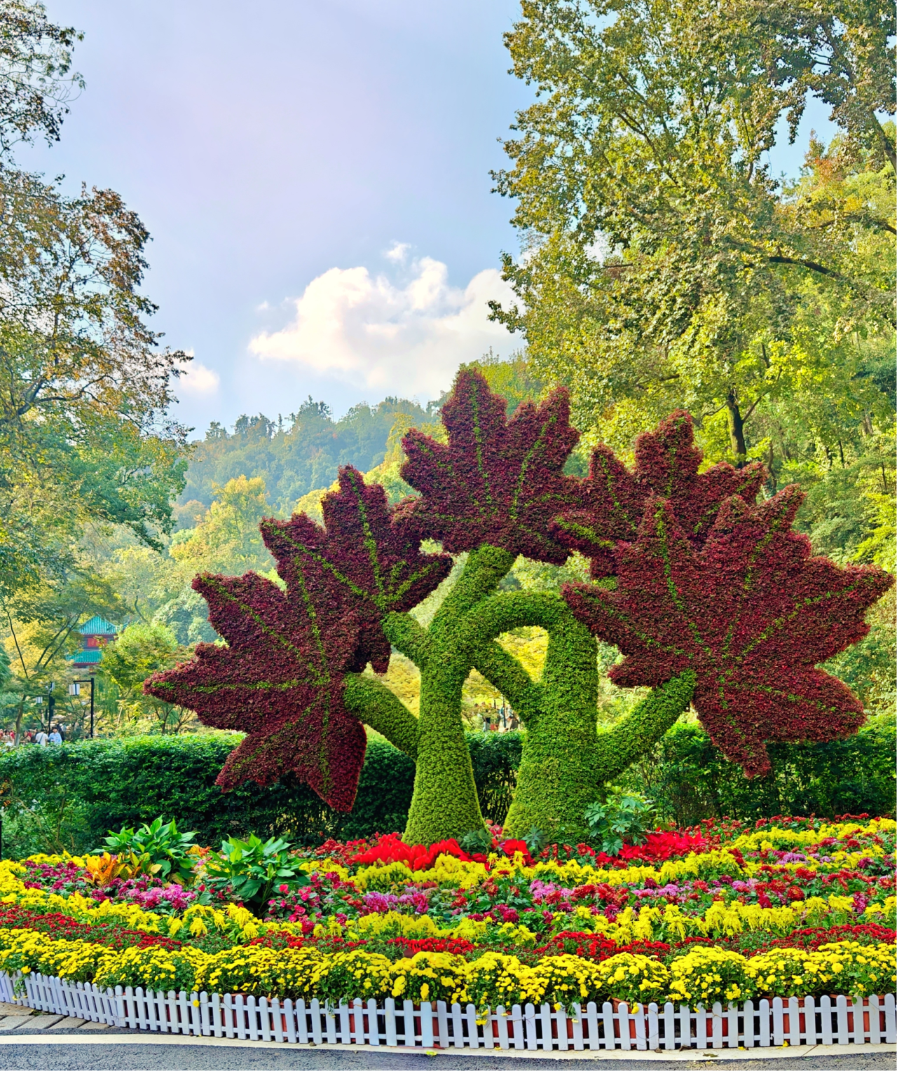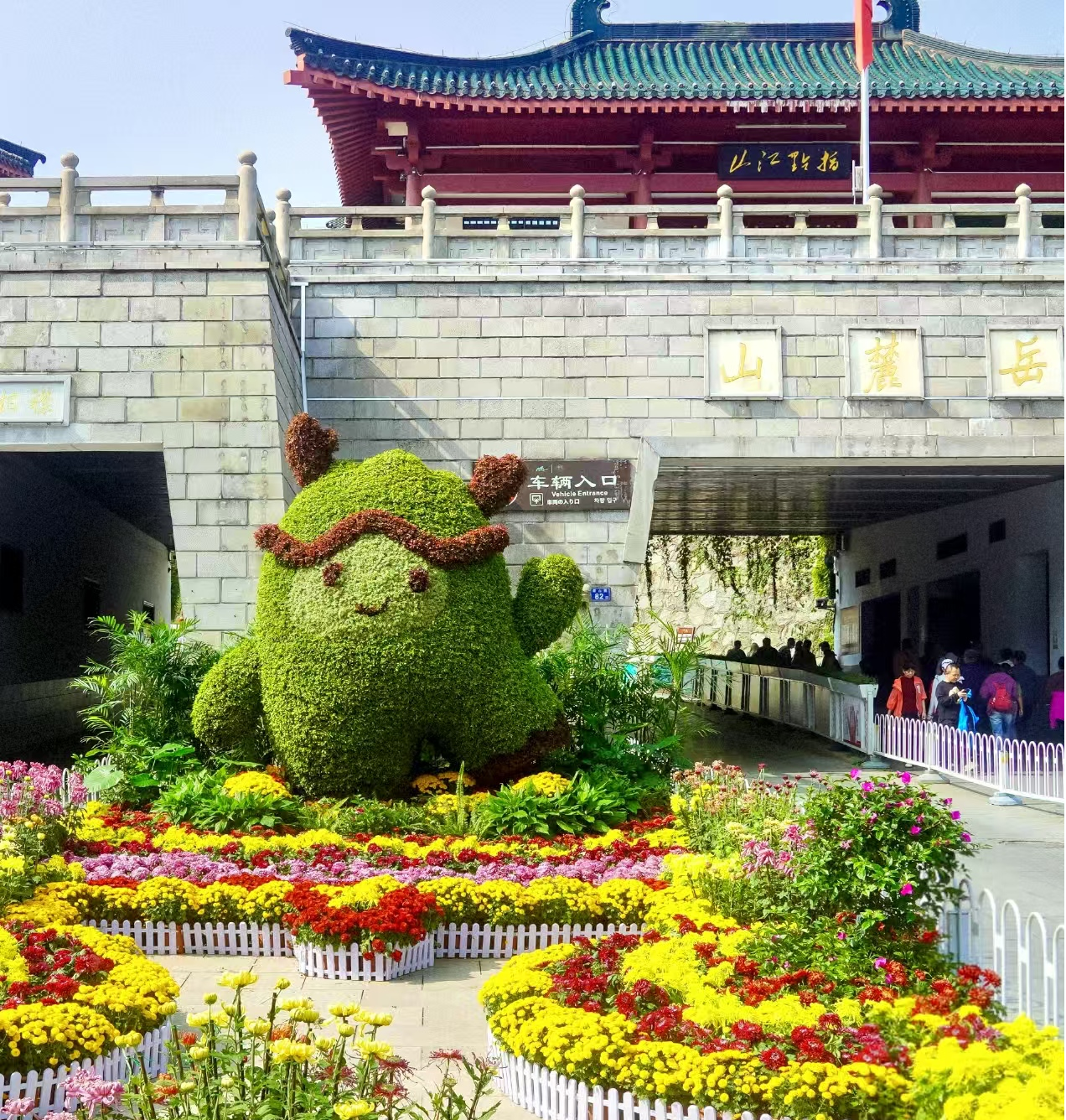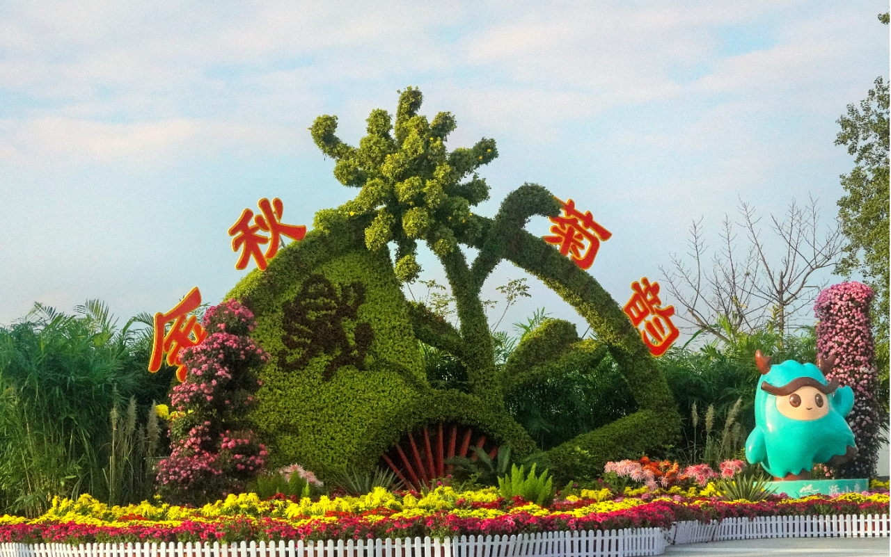 东门处,吉祥物掩映在缤纷菊丛中,似含笑揖客。那不是喧哗的迎宾,而是如古人“采菊东篱下,悠然见南山”般的温厚礼意。再往山间行去,索道下站的“孔雀开屏”以多色菊构架羽翼,宛若神鸟自《山海经》飞出,衔秋色为信,引游人步入麓山深处。