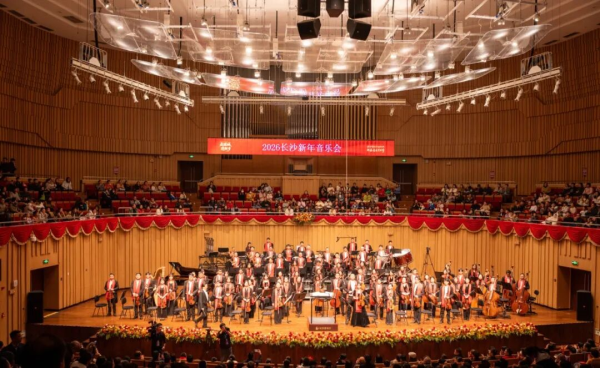 12月28日晚,2026长沙新年音乐会在长沙音乐厅上演。本场音乐会融汇中西、雅韵飞扬,兼顾传统与创新、民族与世界,演绎了管弦乐《复兴之光》、二重唱《饮酒歌》、通俗演唱《上场》、湘剧高腔《沁园春·长沙》、京胡独奏《夜深沉》等12首音乐作品。音乐会由长沙市委、市政府主办,市委宣传部、市文旅广电局承办,长沙交响乐团执行。