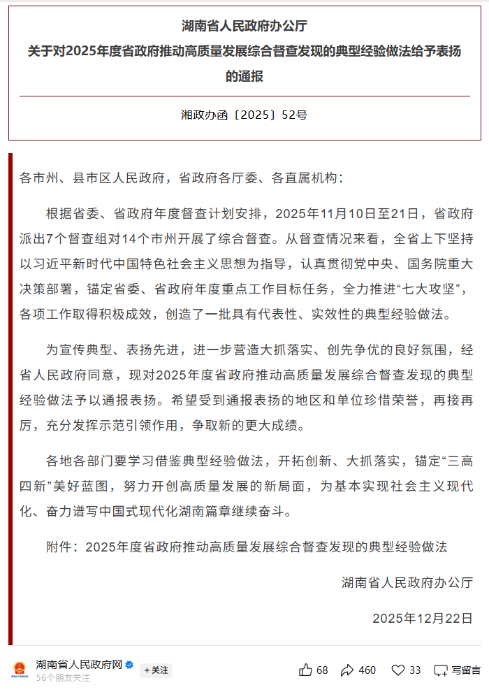 12月22日,湖南省人民政府办公厅发布关于对2025年度省政府推动高质量发展综合督查发现的典型经验做法给予表扬的通报,其中长沙市“三融”路径激发文化和科技融合新动能获省政府通报表扬。