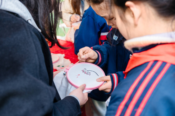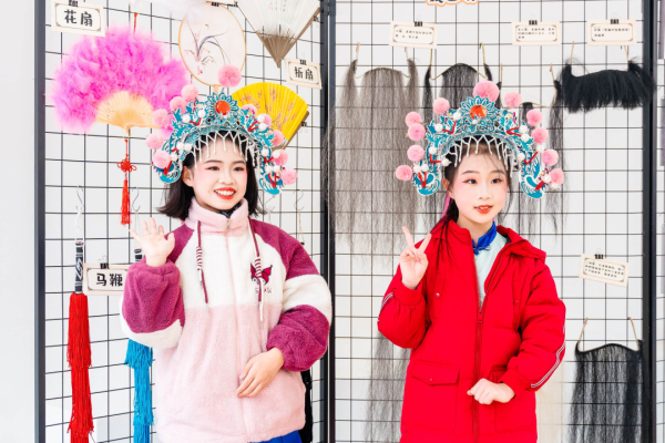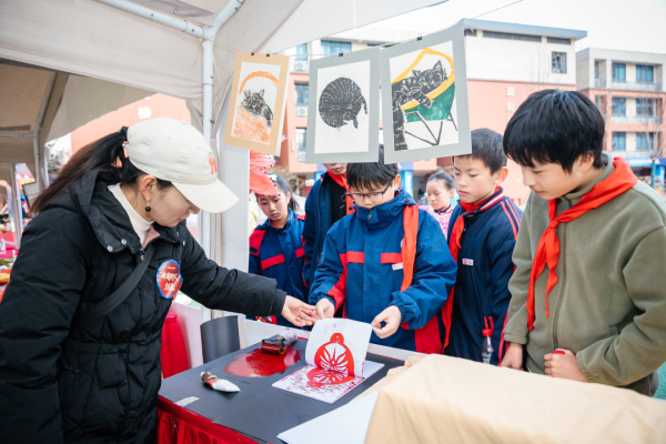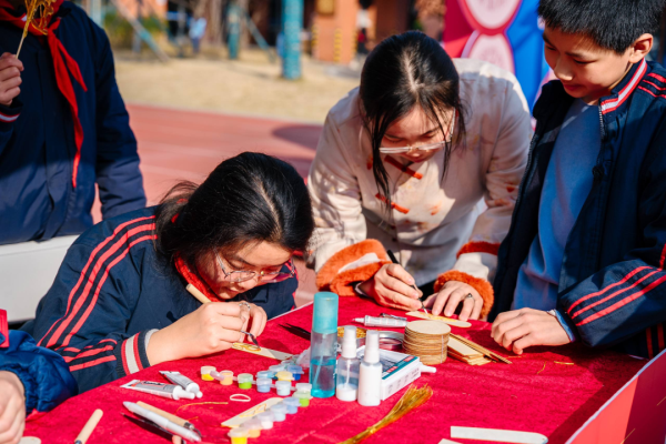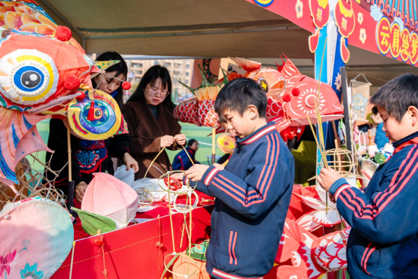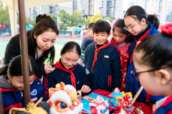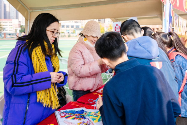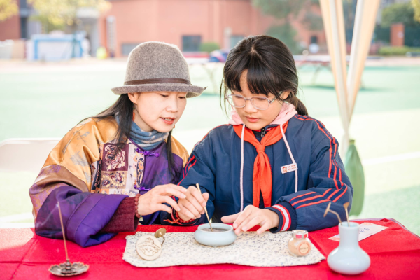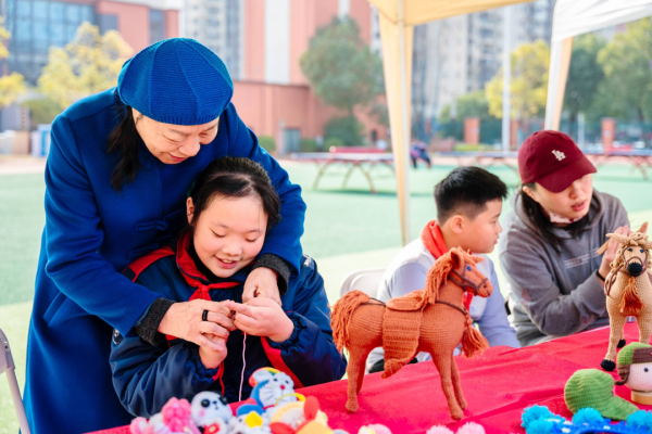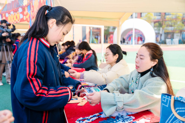 田径场上的文化集市更是人气爆棚,20个主题展位包括湘绣、长沙弹词、皮影戏(长沙皮影戏)、湘剧脸谱等大批非遗项目展示互动,非遗传承人现场教学、“非遗提灯人”细致讲解、学生非遗手作展示义卖相映成趣。弹词小擂台上,学生大胆挑战省级代表性传承人王志敏,一唱一和中尽显少年风采;染缬小工坊里,孩子们专注制作印花香囊;榫卯工坊中,大家潜心拼搭传统木制构件……一件件戏曲主题的非遗手工作品在此成为孩子们关注的焦点、交换的礼物与分享的乐趣。