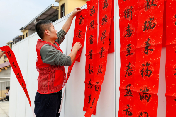 (志愿者展示春联)