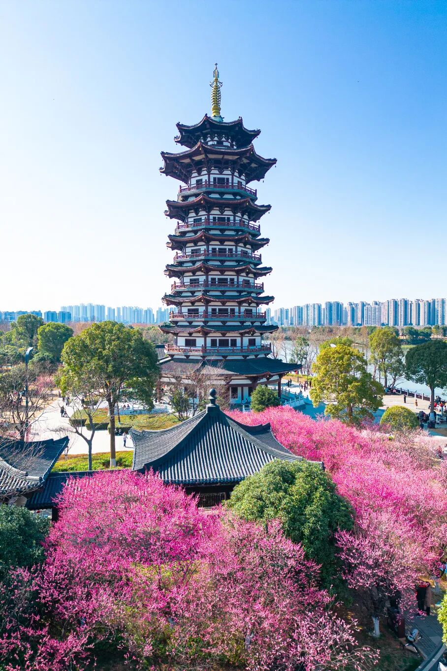粉白艳红的梅枝与澄澈湖水、古朴塔楼相映,“城市绿肺”的冬日诗意瞬间火遍全国。