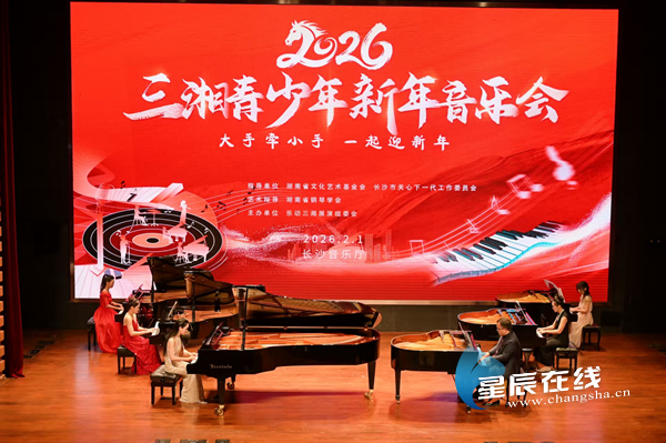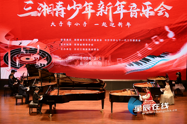 星辰在线2月1日讯(星辰全媒体记者 罗建勋)2月1日下午,“大手牵小手,一起迎新年”2026三湘青少年新年音乐会在长沙音乐厅举行。音乐会汇聚了来自三湘大地的青少年音乐爱好者,共迎马年新春。本次活动在湖南省文化艺术基金会、长沙市关心下一代工作委员会指导下,由湖南省钢琴学会担任艺术指导,乐动三湘展演组委会、长沙时代星城文化科技有限公司主办。省市相关单位领导、艺术嘉宾,以及来自长沙、株洲、湘潭、怀化等地的师生、家长和媒体代表共同观看了演出。