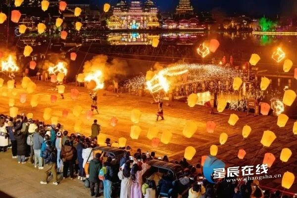 随着“腾城迎宾”倡议深入人心,市民主动“让景于客”,带动了城市周边游的热潮。靖港古镇新春灯会上,流光溢彩的花船与沿岸NPC演绎交织成流动的画卷;铜官窑国风乐园打造“白天玩不够、夜晚更精彩”的超级大夜场;天空剧场85分钟定制焰火璀璨绽放,欢呼声与惊叹声不绝于耳。初恋茶馆的乡村音乐联欢会唱响田园欢歌,宁乡市花鼓戏惠民演出与迎春美术作品展则让传统艺术在乡村的烟火气中焕发新彩。