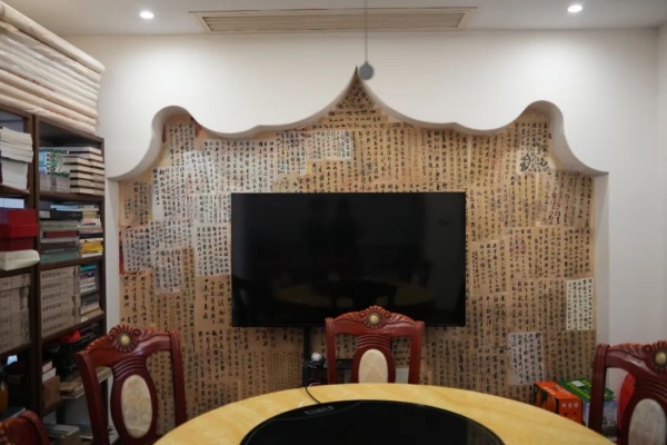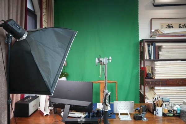 黄聪解释书斋“大随堂”的由来,是某日随手翻开《易经》,入眼的便是“随卦”,他觉得寓意很好,且“随”有“从善如流”之意,正合当时的心境,他便取字入斋名。大随堂里,写有“大随堂”的牌匾置于书架顶端,被书籍遮挡部分;日常创作的作品被随意贴在电视机后的墙上,毫无章法,但令人眼前一亮;直播区、创作区与休憩区共存一室,偶有专业物品的错放,但看起来并不违和;笔筒里,彩色鱼漂比长短不一的毛笔更为吸睛……