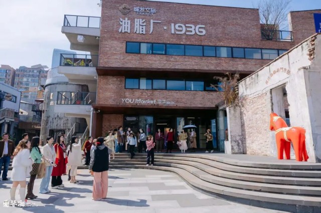 长沙油脂厂见证了长沙工业发展历史,为发展长沙经济,保障市民供给做出了重要贡献。保留下来的老门市部残墙,斑驳的水泥墙面与裸露红砖交错,上方保留着繁体的“長沙油脂廠門市部”字样,旁边立着一只色彩鲜亮的红色木马装置,复古沧桑与童趣活泼形成强烈对比。