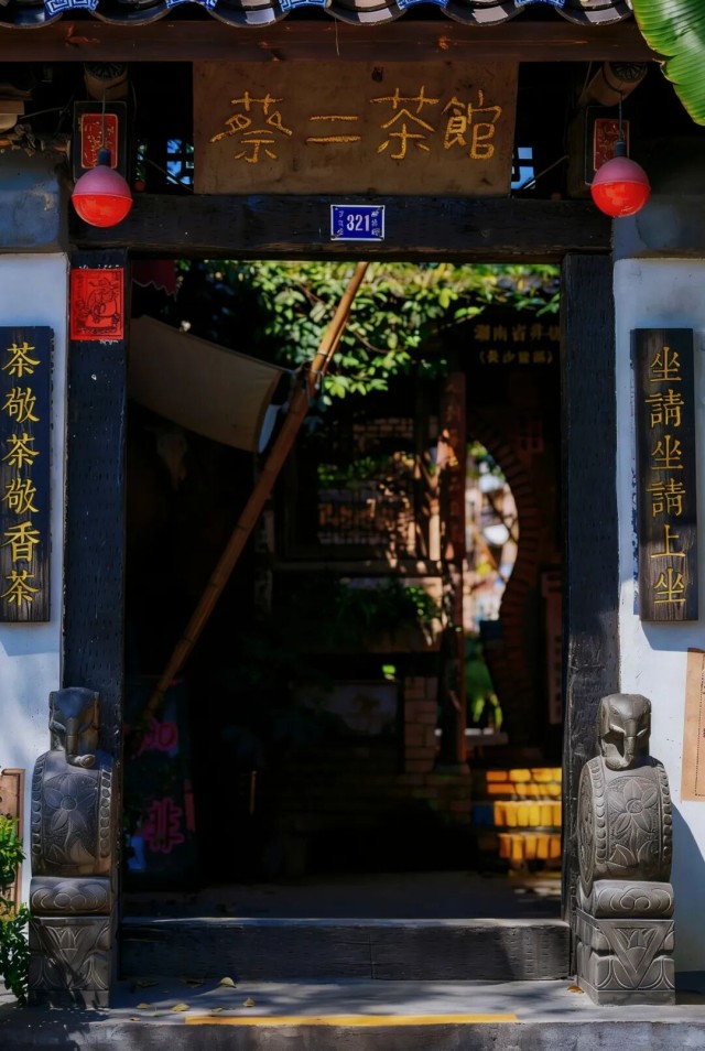 老樟树的浓荫覆盖着露天茶座,木构老宅临水而建,彩色玻璃窗、雕花栏杆与临水戏台错落排布,阳光透过枝叶在地面投下斑驳光影,像一幅活的老长沙市井画。