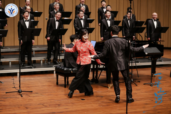 返场曲目《回娘家》彻底释放,团员们用夸张的肢体语言和表情,演绎“飞鸡跑鸭”“刮风下雨”的窘境,市职工星辰合唱团团长李静身穿大红袄配合演绎,打破了肃穆的氛围;另一首返场曲目《缆车》是意大利经典民歌,团员们用意大利语演唱,或许发音不够标准,却轻快活泼,张弛有度,让现场气氛高潮迭起。