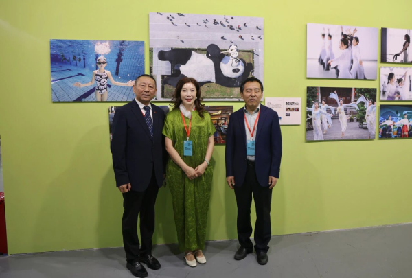 (中国摄影家协会副主席线云强〔左一〕、《中国摄影》杂志社有限责任公司董事、经理柴选〔右一〕与李玲立在第30届全国摄影艺术展览上合影。受访者供图)
