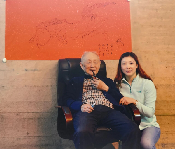 (2014年,李玲立在凤凰玉氏山房和大伯黄永玉合影)