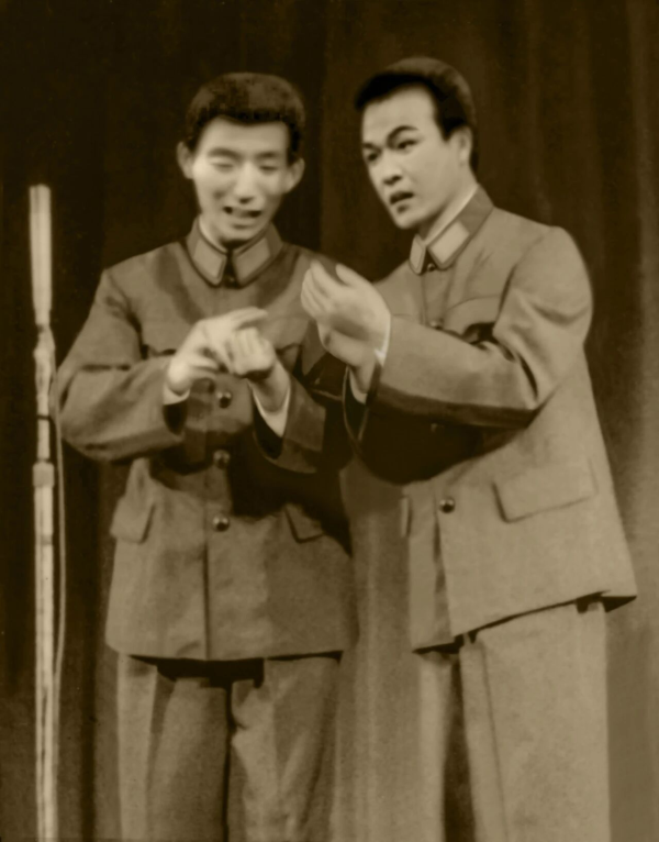 (芦克宁〔右〕在部队演出相声时的留影)