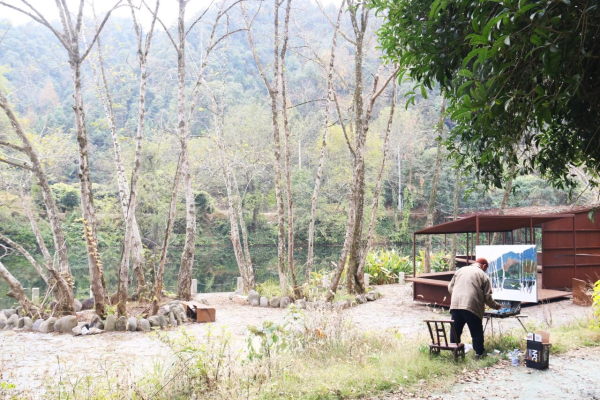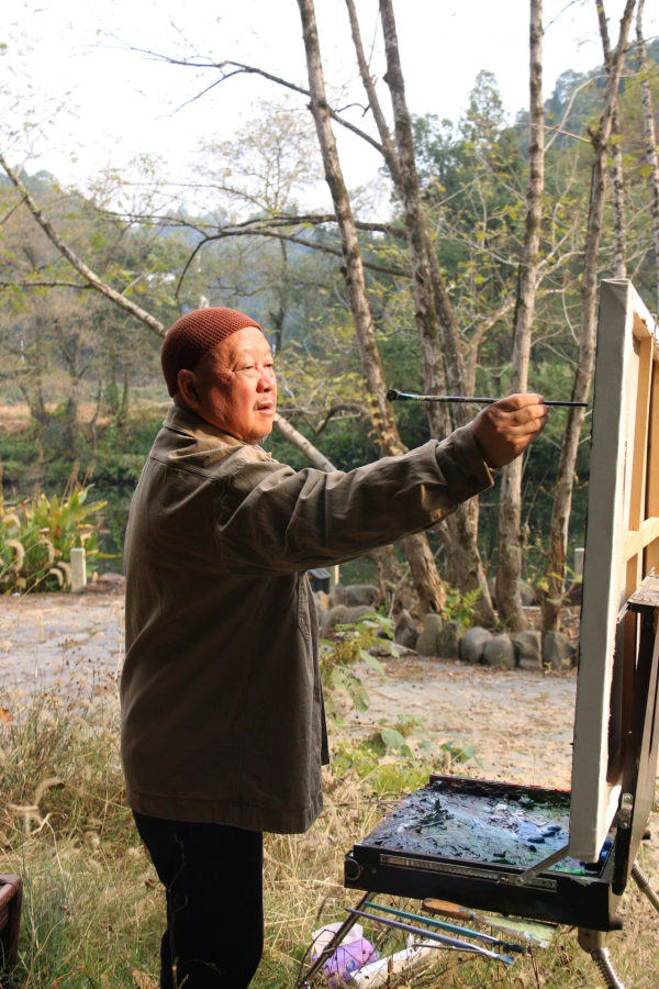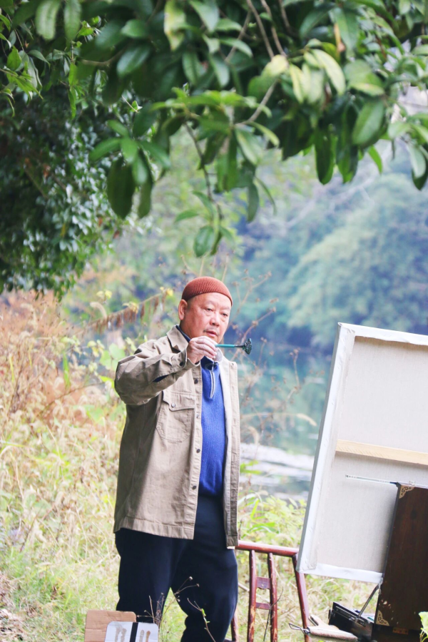 冬日,天晴风和。浏阳小溪河畔,段江华立于溪山亭旁,架上挂钩画箱,挤压颜料调色。