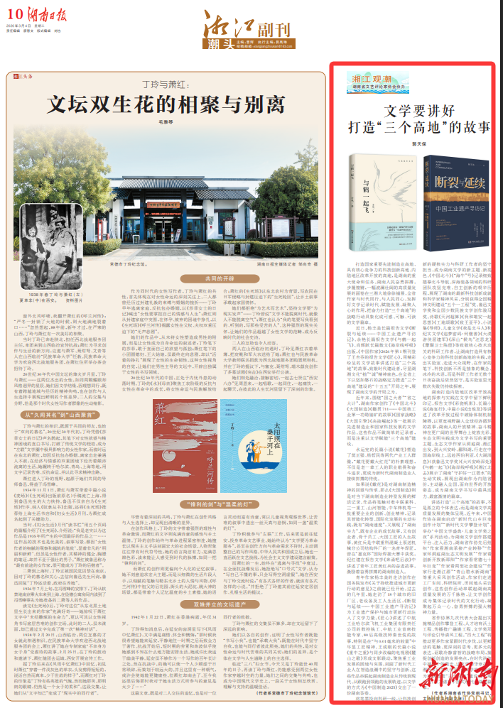 近日,杨丰美长篇报告文学《断裂与延续——中国工业遗产寻访记》、余艳长篇报告文学《与鹤一起飞》、肖辉跃长篇散文《海岸线呼吸》出版,《中国作家》2026年第1期刊登了王杏芬的报告文学《匠心》,用精彩纷呈的文学故事讲述打造“三个高地”的故事,致敬时代建设者,尽显湖湘文化“拙”“诚”精神底色,在全省上下以坚如磐石的战略定力推进“三个高地”建设的“十五五”开局之年,展现了湖南文学的开局之为。