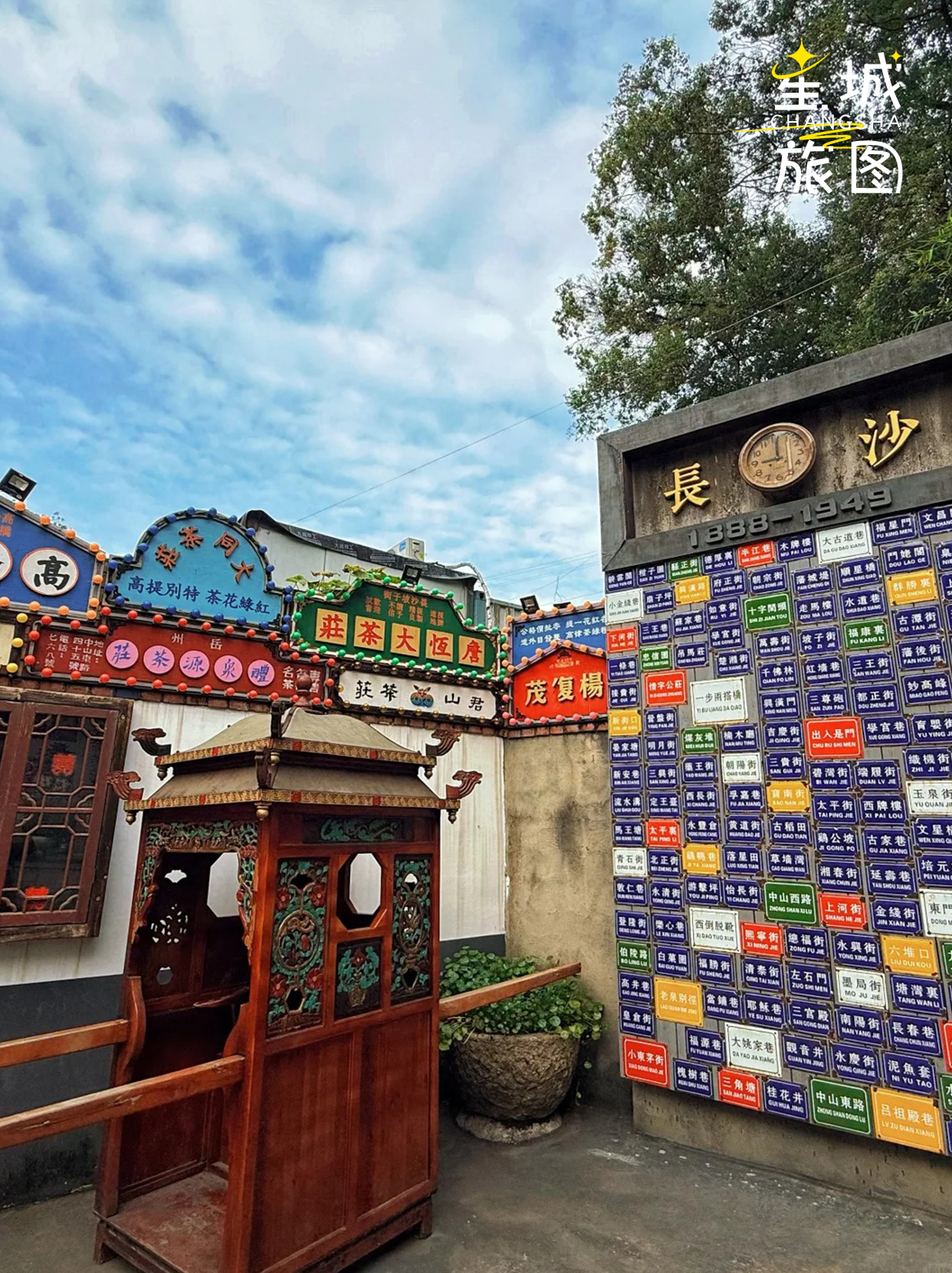 老物说话:老式花轿、民国黄包车、铜制茶担随意陈列,40多面老字号牌匾在屋檐下斑驳发光,最震撼的是那面老地名墙——文夕大火前的201个长沙老地名清晰镌刻,指尖划过仿佛触摸城市年轮。