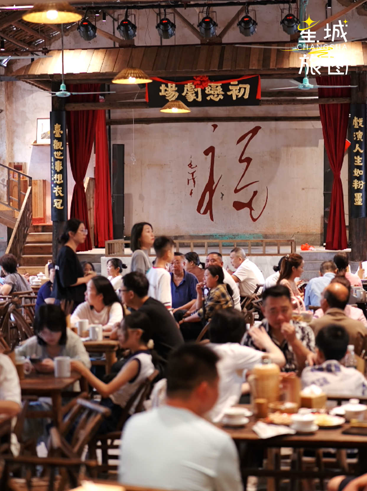 茶馆中央的“初恋剧场”好戏连台!每天都有湖南花鼓戏、开慧手鼓表演,偶尔还有脱口秀逗得人捧腹。戏台边的茶座从不缺热闹:芝麻豆子茶冒着热气,糖油粑粑软糯香甜,招牌八大碗里的柴火菜藏着老长沙滋味,人均几十元就能吃得满足。