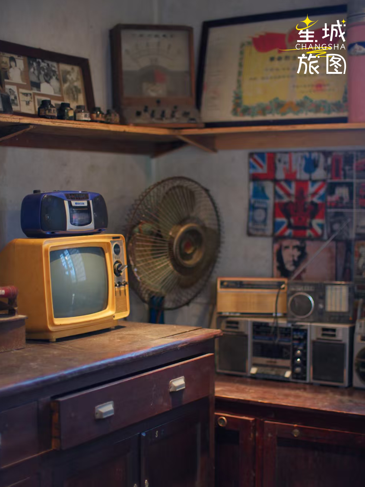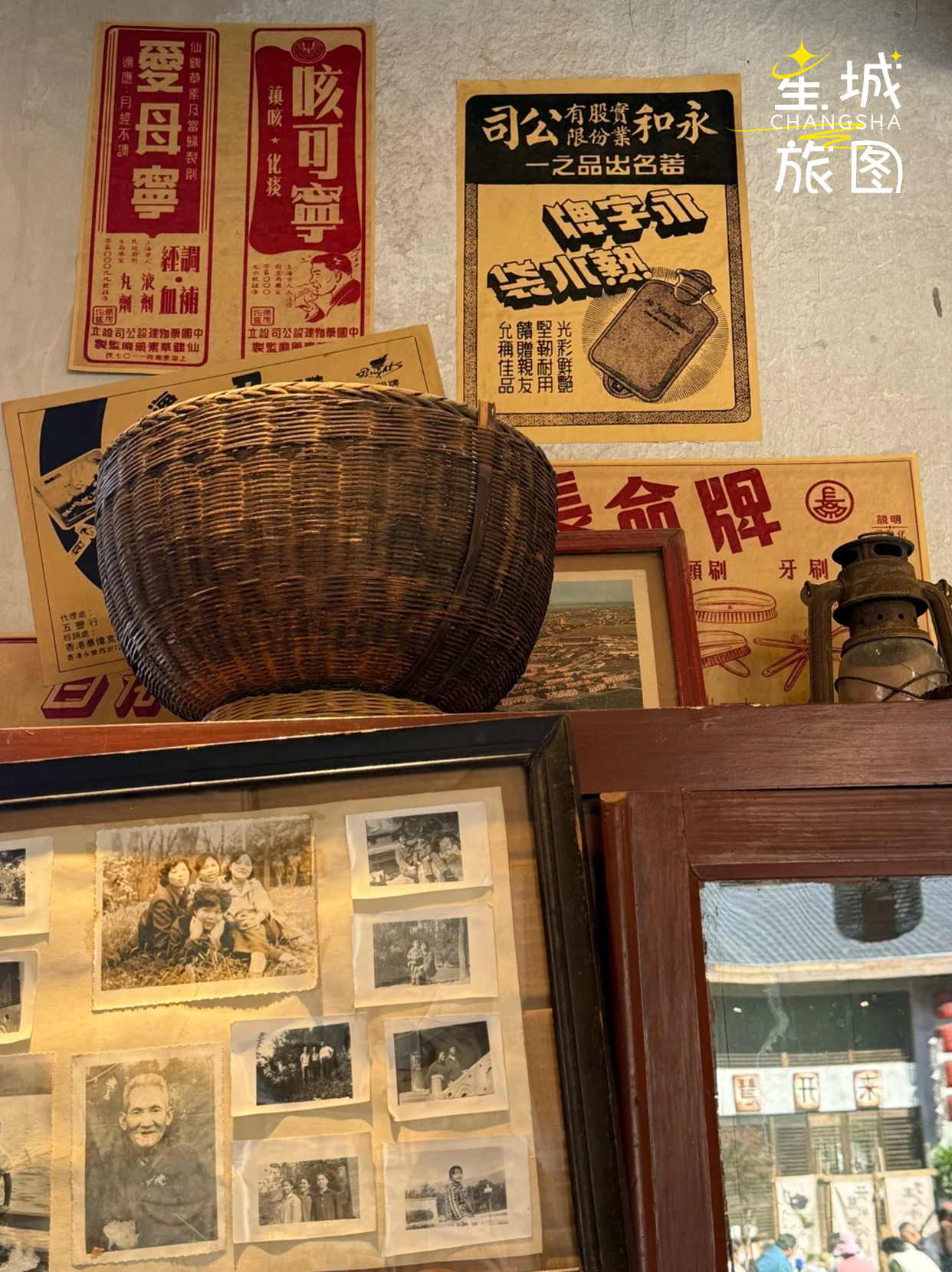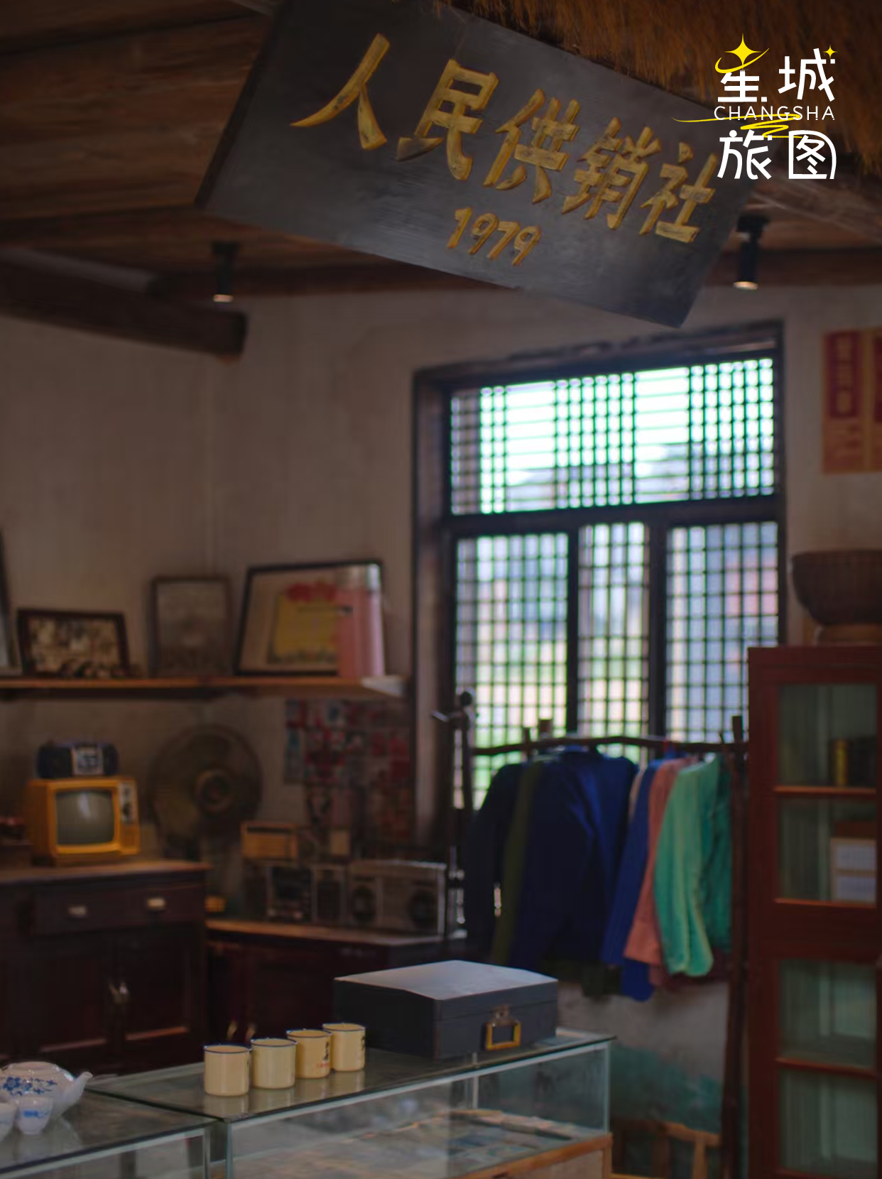 1979年的老供销社改造而来的庭院,藏着600多件村民捐赠的老物件,每一件都带着生活的温度。进门先见屋顶晒着玉米、辣椒的“晒秋盛景”,红砖墙映着暖黄灯光,老式收录机循环着《在希望的田野上》,缝纫机、搪瓷杯、旧账本随意陈列,瞬间穿越到八十年代的乡村市集。