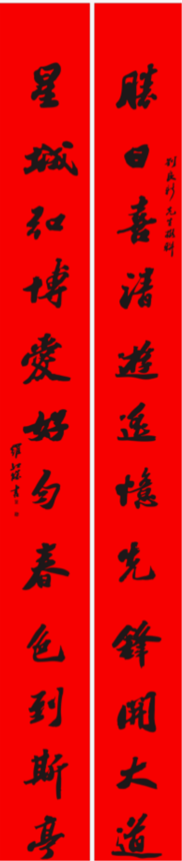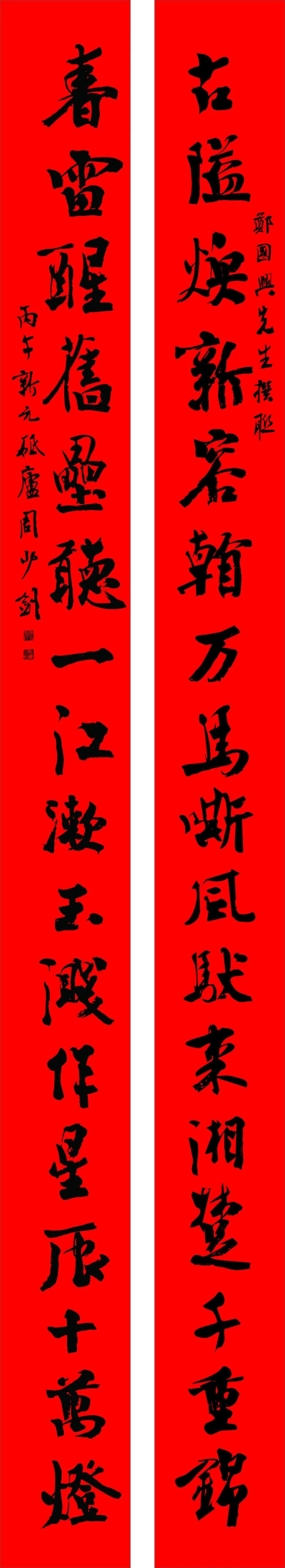解读:上联精准概括了浏阳门从古代军事堡垒到现代城市景观的蜕变过程。下联蕴含新年新气象,一幅国家安宁,人民康泰的美好蓝图。其中“焕”字既指城楼建筑外观的修缮更新,更喻指湖湘文化记忆的动态传承,凸显更新力度;“醒”字既指春天万物苏醒,亦指文化、思想、精神的觉悟觉醒,彰显传承效果;“驮”字承接上句“万马嘶风”,强化历史承载;“溅”字强调长沙作为“星城”的地域特色动态呈现。