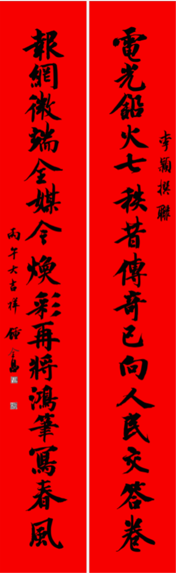 下联以“报网微端”的媒体矩阵切入,精准概括全媒体时代的传播格局:报纸的深度、网站的广度、微信的互动、客户端的便捷,四者构成立体融媒传播体系。“全媒今焕彩”既是对媒体融合成果的肯定,又暗含对新时代媒体的创新要求。全联结尾“再将鸿笔写春风”为点睛之笔:“鸿笔”指媒体人的如椽大笔;“春风”既指新春的来临,又化用“春风化雨”之典,将媒体的社会责任转化为温暖可感的文化表达,使全联超越了一般性的行业颂联,有了更深远的人文价值。