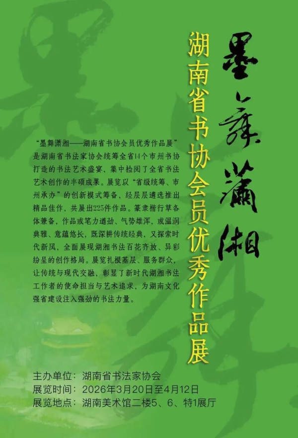 湖南省书法家协会统筹全省14个市州书协打造的书法艺术盛宴,集中检阅全省书法艺术创作的丰硕成果。以“省级统筹、市州承办”创新模式筹备,经层层遴选推出225件精品佳作,篆隶楷行草各体兼备,作品或笔力遒劲、气势雄浑,或温润典雅、意蕴悠长,既深耕传统经典,又探索时代新风,全面展现湖湘书法百花齐放、异彩纷呈的创作格局,为湖南文化强省建设注入强劲书法力量。