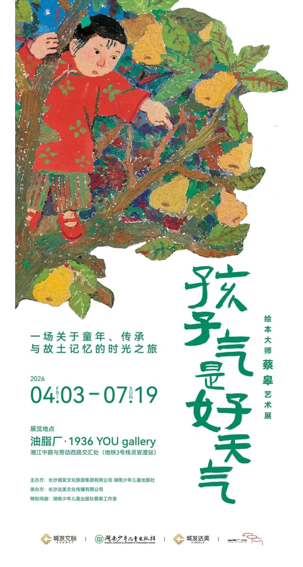 以“孩子气是好天气”为主题,分“日子里,揣着孩子气”“故事里,藏着孩子气”“故土里,守着孩子气”三个主题篇章,集中呈现蔡皋《中国美丽故事》《月亮粑粑》《火城1938》《出生的故事》等代表作品,依托其充满温度与想象力的绘本创作,唤醒观众内心深处的纯真与美好,凝练展现蔡皋扎根本真、以孩童般澄澈目光凝视世界的艺术理念。
