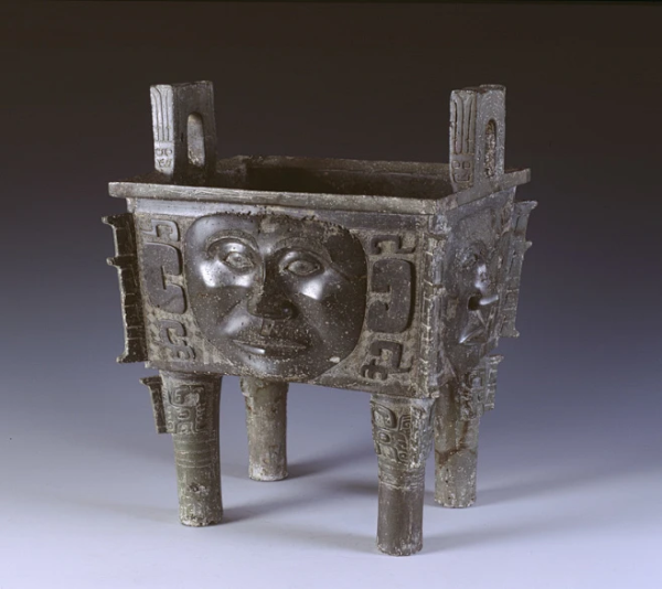 整体呈长方形,立耳,四圆柱足。腹部四面均饰一浮雕人面,口内壁铸禾(或释“大禾”)铭文。人面阔嘴高鼻、神态肃穆,两侧有一对大耳,下有类似兽面纹的角和爪。