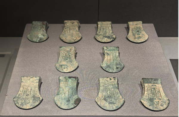 1959年黄材镇寨子山出土兽面纹铜瓿中所藏,共计224件。斧有长方形銎,弧形双面刃,刃部外扩。斧身两面饰线条纹。