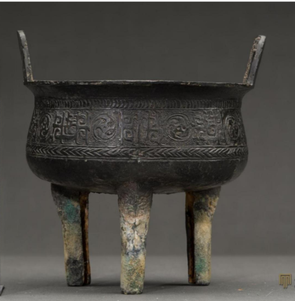 盆形腹,立耳。三锥足,足内侧空心,足尖外折,足尖为实心。腹部装饰一周变形夔纹,中间装饰涡纹,同时上方还以栉纹框边,下方装饰燕尾状的曲折纹。